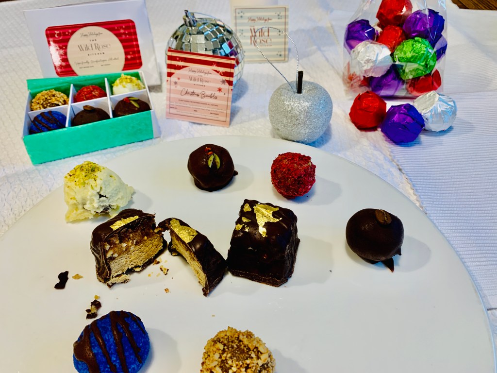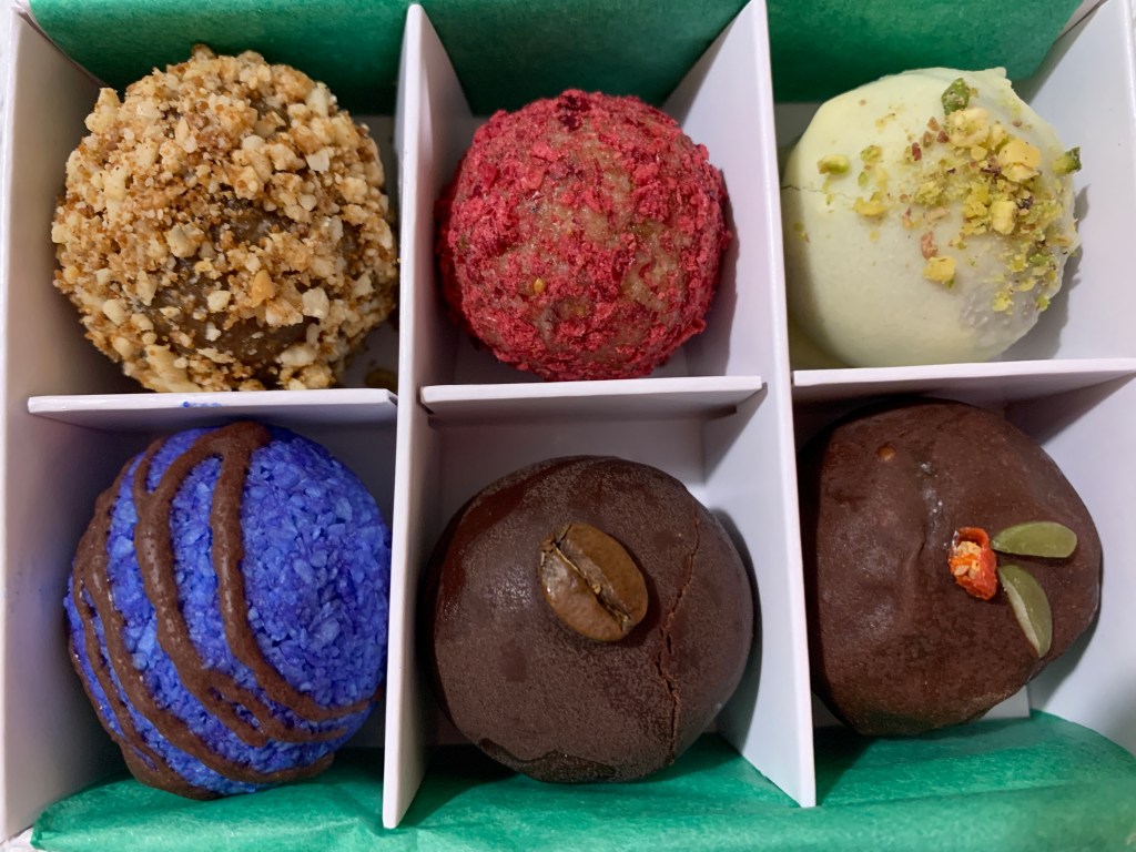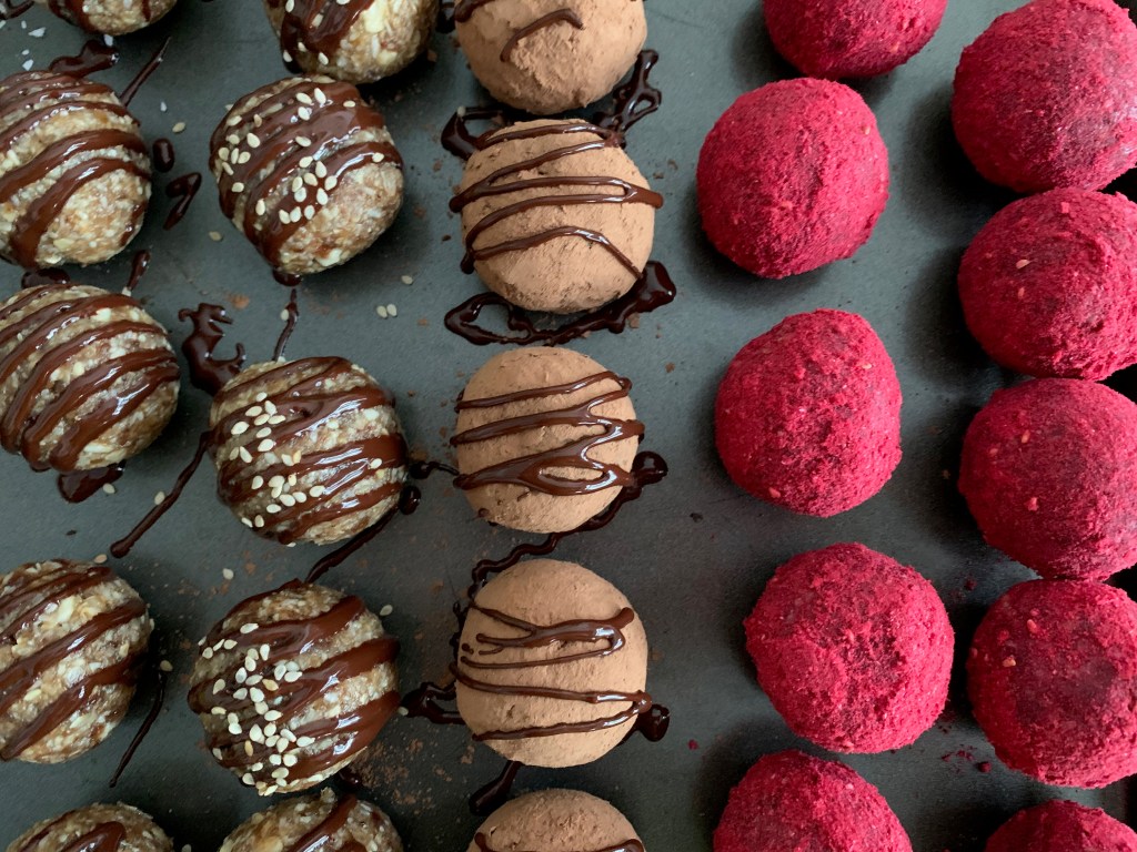 Hand-rolled bliss balls made from nuts, fruits, cacao and spices, each one naturally coloured with ingredients like raspberry, pistachio, spiced cocoa and blue spirulina. These luxurious, flavour-layered baubles make a beautiful festive gift or centrepiece.