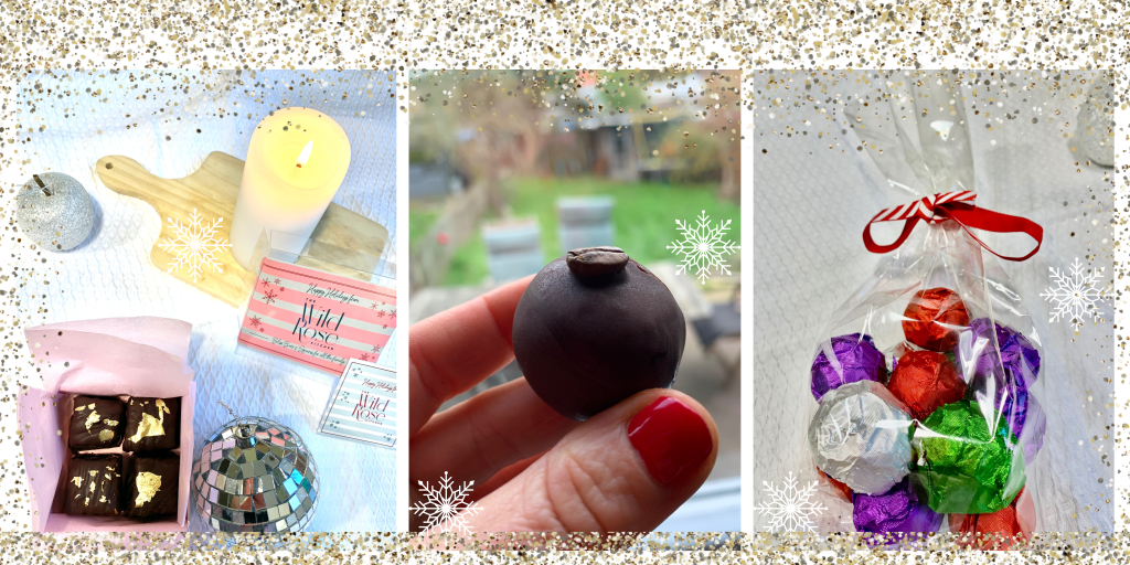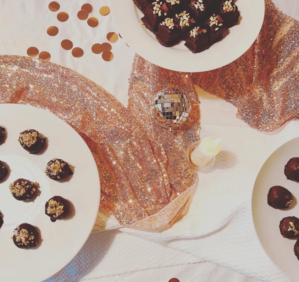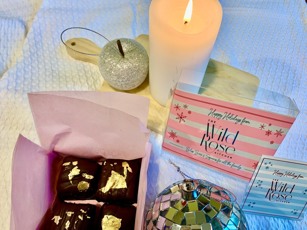 Silky, rich, plant-based truffle squares dipped in dark chocolate. Your selection will contain Mocha, Wild Rose Snickers and Black Cherry Bombshell bites, finished individually with gold leaf and flowers. Beautifully wrapped in soft pink tissue, these make a luxurious gift for hosts, teachers, colleagues — or for yourself. Naturally sweetened, entirely plantbased and handmade in small batches.